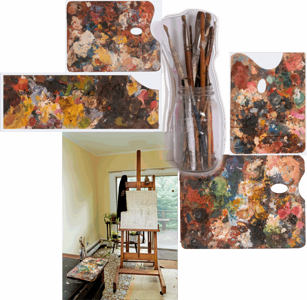 The image above captures Jeanne’s creative world — her worn palettes layered with decades of color, her trusted brushes resting in a jar, and the warmth of the studio where she spent countless hours bringing ideas to life.